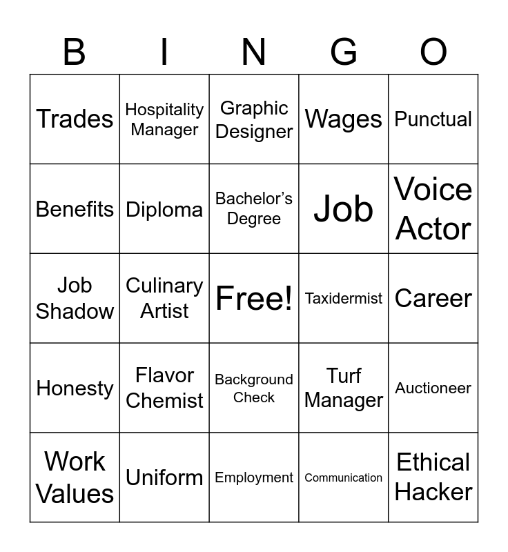 This bingo card has a free space and 35 words: Resume, Application, Interview, Diploma, Background Check, Wages, Benefits, Associates Degree, Bachelor’s Degree, Internship, Job Shadow, Punctual, Volunteer, Workplace, Trades, Taxidermist, Communication, Culinary Artist, Honesty, Ethical Hacker, Turf Manager, Work Values, Auctioneer, Uniform, Graphic Designer, Voice Actor, License, Training, Job, Career, Occupation, Employment, Flavor Chemist, Hospitality Manager and Florist.