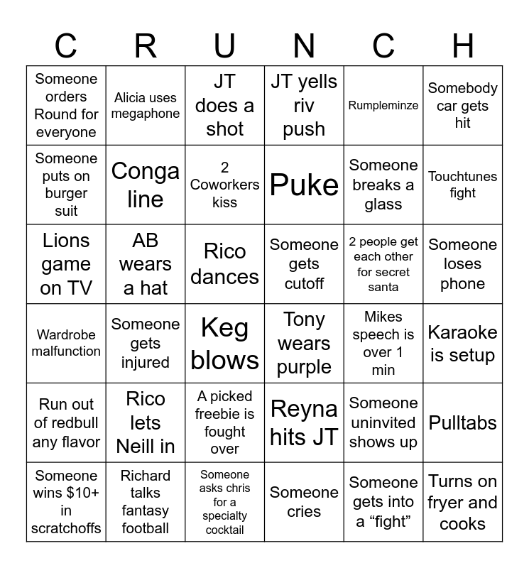 This bingo card has 36 words: Reyna hits JT, A picked freebie is fought over, Someone cries, Someone puts on burger suit, Wardrobe malfunction, Someone gets cutoff, Conga line, Someone asks chris for a specialty cocktail, Rumpleminze, Someone uninvited shows up, Touchtunes fight, JT yells riv push, Pulltabs, AB wears a hat, Puke, Someone orders Round for everyone, Run out of redbull any flavor, 2 people get each other for secret santa, Lions game on TV, JT does a shot, Rico dances, Someone gets injured, Tony wears purple, Keg blows, Mikes speech is over 1 min, Alicia uses megaphone, Someone breaks a glass, Richard talks fantasy football, 2 Coworkers kiss, Somebody car gets hit, Turns on fryer and cooks, Someone wins $10+ in scratchoffs, Karaoke is setup, Someone loses phone, Rico lets Neill in and Someone gets into a “fight”.