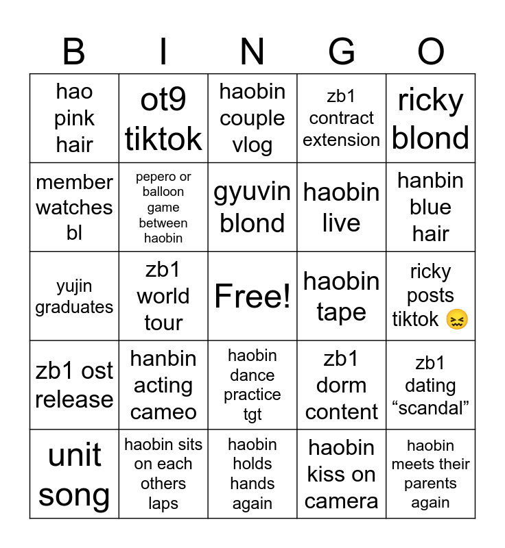 This bingo card has a free space and 24 words: hanbin acting cameo, haobin sits on each others laps, gyuvin blond, unit song, ricky blond, hao pink hair, member watches bl, ot9 tiktok, haobin tape, haobin dance practice tgt, haobin live, yujin graduates, zb1 dorm content, zb1 dating “scandal”, pepero or balloon game between haobin, haobin kiss on camera, ricky posts tiktok 😖, haobin couple vlog, hanbin blue hair, zb1 world tour, haobin meets their parents again, zb1 ost release, zb1 contract extension and haobin holds hands again.