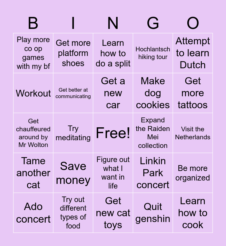 This bingo card has a free space and 24 words: Ado concert, Save money, Get a new car, Quit genshin, Attempt to learn Dutch, Play more co op games with my bf, Get more platform shoes, Learn how to do a split, Expand the Raiden Mei collection, Visit the Netherlands, Get chauffeured around by Mr Wolton, Get better at communicating, Linkin Park concert, Be more organized, Workout, Try out different types of food, Get new cat toys, Hochlantsch hiking tour, Get more tattoos, Tame another cat, Try meditating, Figure out what I want in life, Make dog cookies and Learn how to cook.