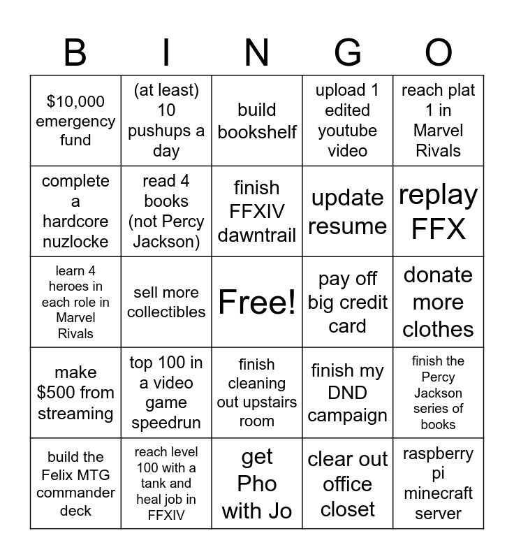 This bingo card has a free space and 24 words: top 100 in a video game speedrun, reach level 100 with a tank and heal job in FFXIV, finish FFXIV dawntrail, build the Felix MTG commander deck, reach plat 1 in Marvel Rivals, $10,000 emergency fund, complete a hardcore nuzlocke, (at least) 10 pushups a day, pay off big credit card, finish cleaning out upstairs room, update resume, learn 4 heroes in each role in Marvel Rivals, finish my DND campaign, finish the Percy Jackson series of books, read 4 books (not Percy Jackson), clear out office closet, donate more clothes, build bookshelf, replay FFX, sell more collectibles, raspberry pi minecraft server, make $500 from streaming, upload 1 edited youtube video and get Pho with Jo.