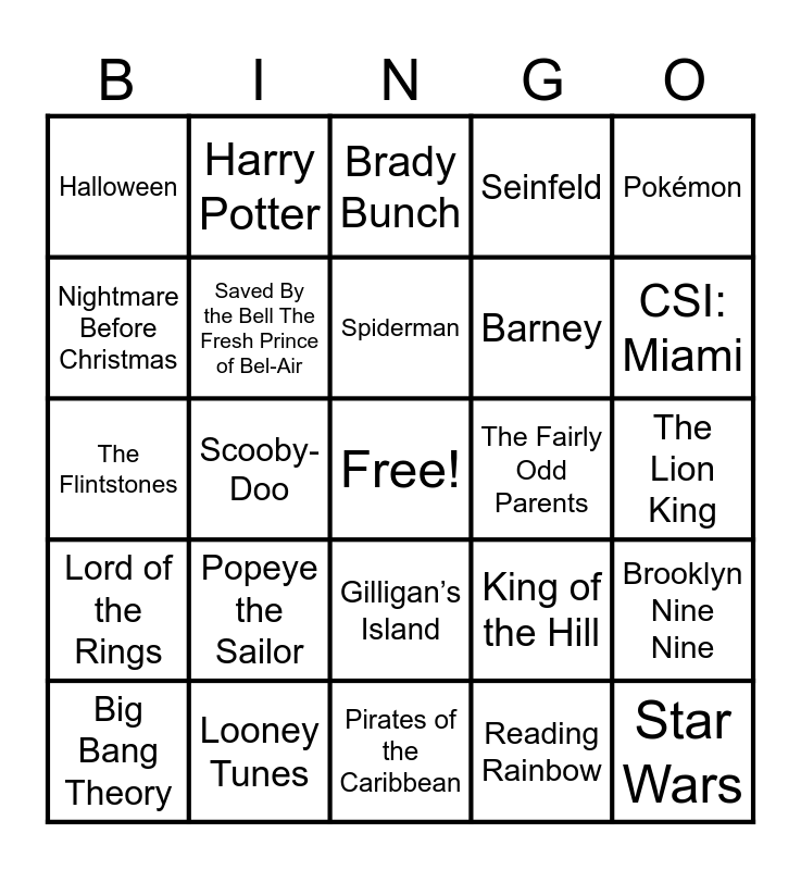 This bingo card has a free space and 39 words: Kim Possible, Ghostbusters, Simpsons, Saved By the Bell The Fresh Prince of Bel-Air, Big Bang Theory, Gilligan’s Island, Spiderman, The Jeffersons, Pokémon, Lord of the Rings, Scooby-Doo, Seinfeld, Star Wars, The Lion King, The Fairly Odd Parents, Popeye the Sailor, That’s So Raven, Halloween, Hannah Montana, King of the Hill, Nightmare Before Christmas, Pirates of the Caribbean, Barney, CSI: Miami, The Addams Family, Care Bears, The Legend of Zelda, The Smurfs, X-Files, Harry Potter, Malcolm in the Middle, Stranger Things, Brady Bunch, Looney Tunes, Reading Rainbow, Hockey Night in Canada, Brooklyn Nine Nine, The Flintstones and I Dream of Jeannie.