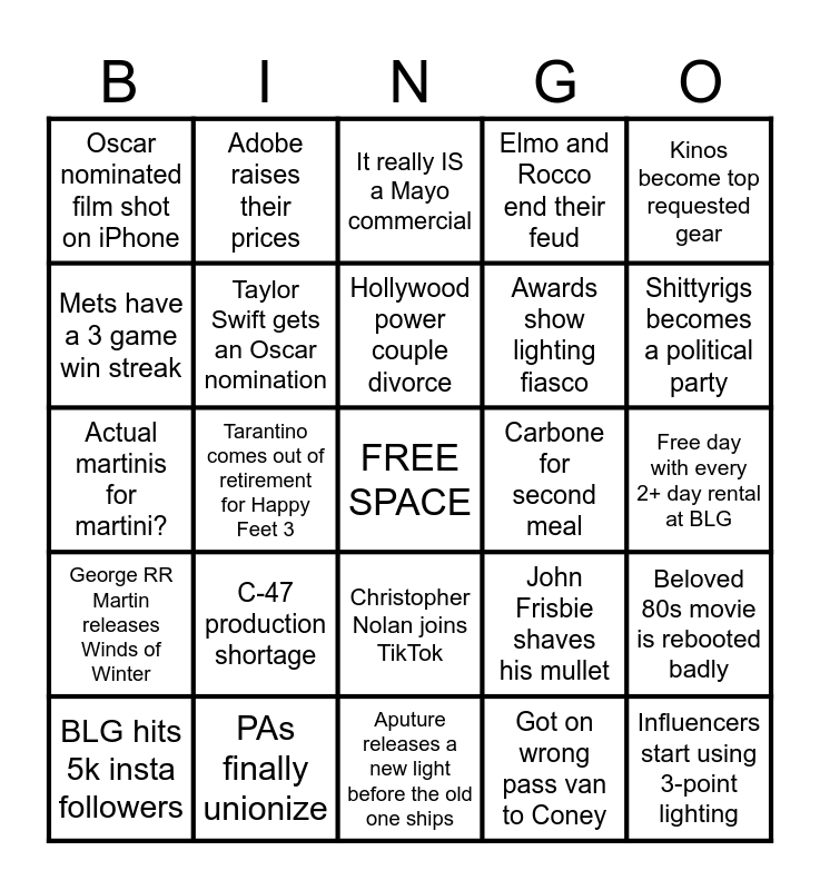 This bingo card has a free space and 24 words: C-47 production shortage, PAs finally unionize, Hollywood power couple divorce, BLG hits 5k insta followers, Kinos become top requested gear, Oscar nominated film shot on iPhone, Mets have a 3 game win streak, Adobe raises their prices, Carbone for second meal, Christopher Nolan joins TikTok, Awards show lighting fiasco, Actual martinis for martini?, John Frisbie shaves his mullet, Beloved 80s movie is rebooted badly, Taylor Swift gets an Oscar nomination, Got on wrong pass van to Coney, Free day with every 2+ day rental at BLG, It really IS a Mayo commercial, Shittyrigs becomes a political party, Tarantino comes out of retirement for Happy Feet 3, Influencers start using 3-point lighting, George RR Martin releases Winds of Winter, Elmo and Rocco end their feud and Aputure releases a new light before the old one ships.