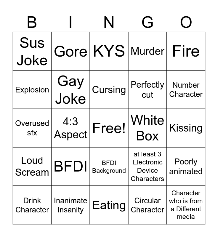This bingo card has a free space and 24 words: BFDI, Inanimate Insanity, Cursing, Drink Character, Fire, Sus Joke, Explosion, Gore, White Box, BFDI Background, Perfectly cut, Overused sfx, at least 3 Electronic Device Characters, Poorly animated, Gay Joke, Circular Character, Kissing, KYS, Number Character, 4:3 Aspect, Character who is from a Different media, Loud Scream, Murder and Eating.