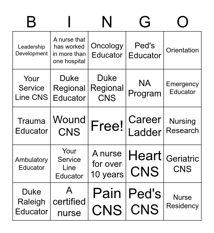 This bingo card has a free space and 24 words: Your Service Line Educator, A certified nurse, Duke Regional CNS, Duke Raleigh Educator, Orientation, Leadership Development, Your Service Line CNS, A nurse that has worked in more than one hospital, Career Ladder, A nurse for over 10 years, NA Program, Trauma Educator, Heart CNS, Geriatric CNS, Duke Regional Educator, Ped's CNS, Nursing Research, Oncology Educator, Emergency Educator, Wound CNS, Nurse Residency, Ambulatory Educator, Ped's Educator and Pain CNS.