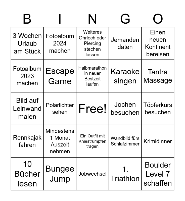 This bingo card has a free space and 25 words: Mindestens 1 Monat Auszeit nehmen, Jobwechsel, Halbmarathon in neuer Bestzeit laufen, 10 Bücher lesen, Einen neuen Kontinent bereisen, 3 Wochen Urlaub am Stück, Fotoalbum 2023 machen, Fotoalbum 2024 machen, Jochen besuchen, Ein Outfit mit Kniestrümpfen tragen, Karaoke singen, Bild auf Leinwand malen, Wandbild fürs Schlafzimmer, Krimidinner, Escape Game, Handstand lernen, Töpferkurs besuchen, Weiteres Ohrloch oder Piercing stechen lassen, Tantra Massage, Polarlichter sehen, Boulder Level 7 schaffen, Bungee Jump, Rennkajak fahren, Jemanden daten and 1. Triathlon.