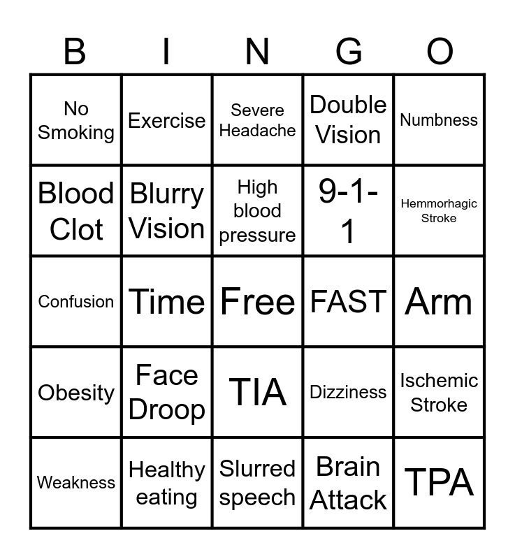 This bingo card has a free space and 24 words: Face Droop, Healthy eating, High blood pressure, Weakness, Numbness, No Smoking, Blood Clot, Exercise, FAST, TIA, 9-1-1, Confusion, Dizziness, Ischemic Stroke, Blurry Vision, Brain Attack, Arm, Severe Headache, Hemmorhagic Stroke, Time, TPA, Obesity, Double Vision and Slurred speech.
