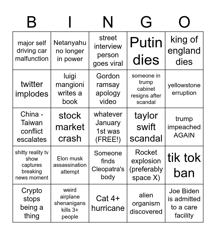 This bingo card has a free space and 24 words: Elon musk assassination attempt, weird airplane shenanigans kills 3+ people, Gordon ramsay apology video, Crypto stops being a thing, king of england dies, major self driving car malfunction, twitter implodes, Netanyahu no longer in power, taylor swift scandal, Someone finds Cleopatra's body, someone in trump cabinet resigns after scandal, China - Taiwan conflict escalates, Rocket explosion (preferably space X), tik tok ban, luigi mangioni writes a book, alien organism discovered, trump impeached AGAIN, street interview person goes viral, yellowstone erruption, stock market crash, Joe Biden is admitted to a care facility, shitty reality tv show captures breaking news moment, Putin dies and Cat 4+ hurricane.