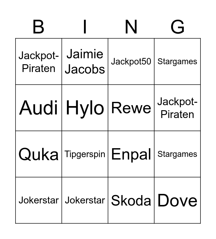 This bingo card has 16 words: Jokerstar, Stargames, Jackpot50, Jackpot-Piraten, Quka, Jaimie Jacobs, Enpal, Skoda, Audi, Hylo, Jokerstar, Stargames, Tipgerspin, Jackpot-Piraten, Rewe and Dove.