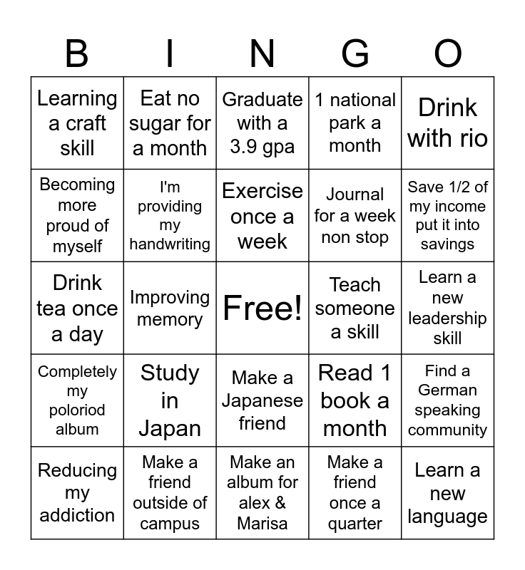 This bingo card has a free space and 24 words: Reducing my addiction, Study in Japan, Exercise once a week, Make a friend once a quarter, Drink with rio, Learning a craft skill, Eat no sugar for a month, Graduate with a 3.9 gpa, Teach someone a skill, Learn a new leadership skill, Drink tea once a day, I'm providing my handwriting, Read 1 book a month, Find a German speaking community, Becoming more proud of myself, Make a friend outside of campus, Make an album for alex & Marisa, 1 national park a month, Save 1/2 of my income put it into savings, Completely my poloriod album, Improving memory, Make a Japanese friend, Journal for a week non stop and Learn a new language.