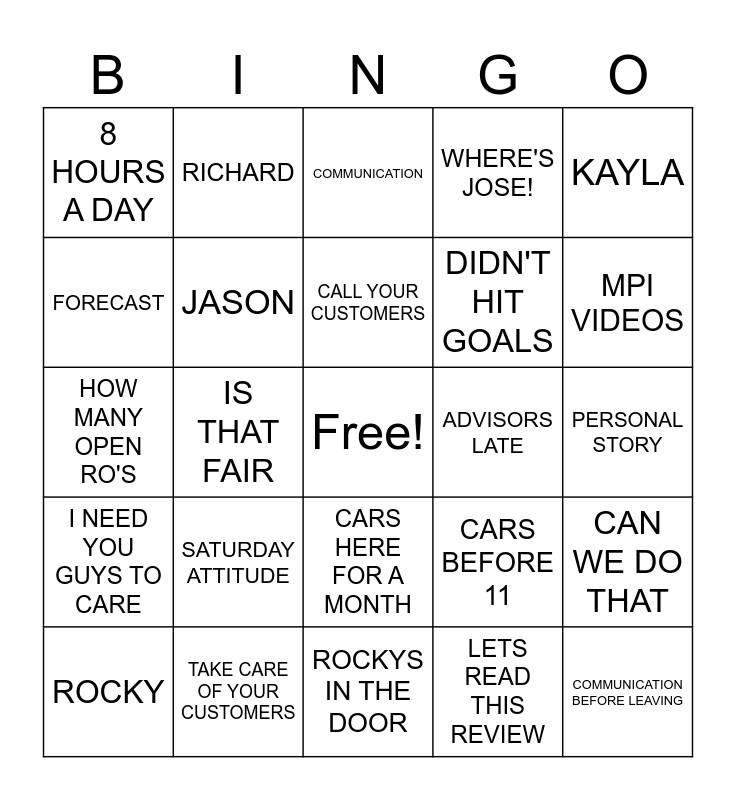 This bingo card has a free space and 33 words: CSI, WHO KEEPS LEAVING EARLY, IS THAT FAIR, DOES THAT MAKE SENSE, I NEED YOU GUYS TO CARE, JASON, KAYLA, ROCKY, RICHARD, JOSE, CALL YOUR CUSTOMERS, COMMUNICATION, MY KARMA, BE ON TIME, ADVISORS LATE, MPI VIDEOS, TAKE CARE OF YOUR CUSTOMERS, HOW MANY OPEN RO'S, SATURDAY ATTITUDE, CARS BEFORE 11, CARS HERE FOR A MONTH, YOUR BAY IS YOUR BUSINESS, 8 HOURS A DAY, PERSONAL STORY, ROCKYS IN THE DOOR, COMMUNICATION BEFORE LEAVING, WHERE'S JOSE!, DIDN'T HIT GOALS, FORECAST, CAN WE DO THAT, SUNSHINE AND RAINBOWS, LETS READ THIS REVIEW and MEETING GOES PAST 9AM.