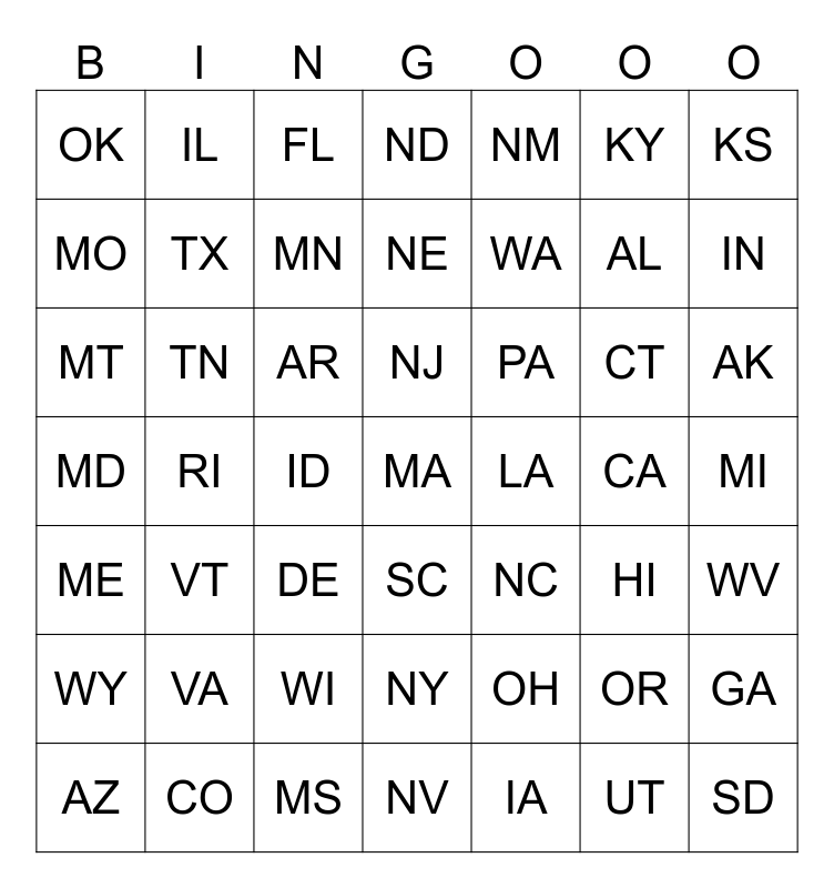 This bingo card has a free space and 48 words: OH, AL, NV, RI, AR, MI, IL, CO, KY, SC, KS, ND, CT, PA, WY, CA, MO, IN, OR, NM, WA, ID, OK, TX, GA, MN, AK, AZ, NJ, TN, UT, LA, WV, VA, MD, NC, HI, MT, DE, WI, ME, SD, FL, MS, NE, NY, VT and IA.