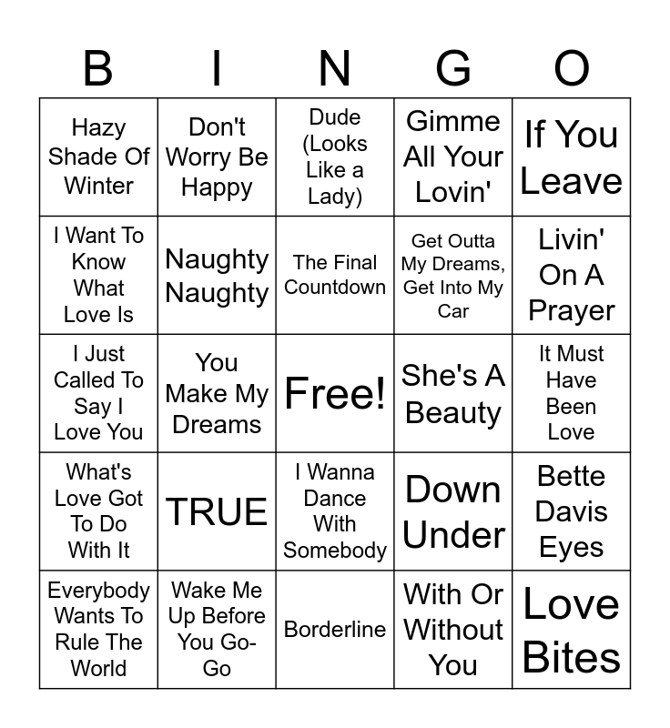 This bingo card has a free space and 56 words: I Want Candy, Everybody Wants To Rule The World, Magic, Hazy Shade Of Winter, Borderline, Sweet Dreams (Are Made of This), Naughty Naughty, Goody Two Shoes, Get Outta My Dreams, Get Into My Car, Don't Stand So Close To Me, Gimme All Your Lovin', Hey Mickey, Love On The Rocks, Don't You (Forget About Me), Never Say Never, Prove Your Love, If You Leave, You Make My Dreams, I'll Tumble For Ya, Love Bites, She's A Beauty, I've Done Everything For You, Down Under, Dude (Looks Like a Lady), Shock The Monkey, The Final Countdown, Beat It, Your Love, Livin' On A Prayer, Sweet Child O' Mine, Careless Whisper, Nothing's Gonna Stop Us Now, Saved By Zero, Hangin' Tough, It Must Have Been Love, I Want To Know What Love Is, I Just Called To Say I Love You, Back In Black, What's Love Got To Do With It, Don't Worry Be Happy, I Wanna Dance With Somebody, Don't Stop Believin', Hungry Eyes, Gloria, I'm Still Standing, TRUE, Wake Me Up Before You Go-Go, Heat Of The Moment, Footloose, Never Tear Us Apart, With Or Without You, Don't Let It End, West End Girls, Hold Me Now, Bette Davis Eyes and She'S Sexy + 17.