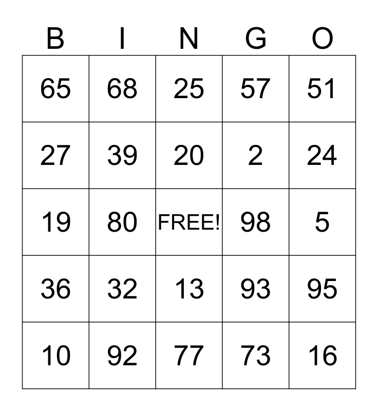 This bingo card has a free space and 24 words: 32, 92, 20, 10, 51, 65, 27, 68, 98, 13, 2, 19, 93, 95, 39, 73, 5, 25, 24, 80, 16, 36, 57 and 77.