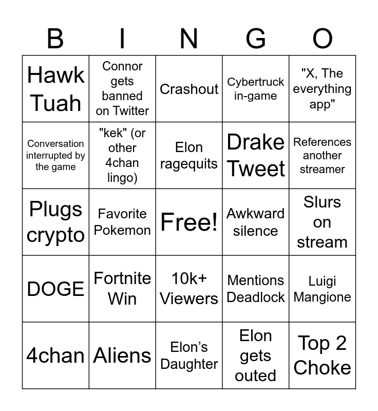 This bingo card has a free space and 24 words: Fortnite Win, Aliens, Elon ragequits, 4chan, "X, The everything app", Hawk Tuah, Conversation interrupted by the game, Connor gets banned on Twitter, Awkward silence, 10k+ Viewers, Drake Tweet, Plugs crypto, Mentions Deadlock, Luigi Mangione, "kek" (or other 4chan lingo), Elon gets outed, Slurs on stream, Crashout, References another streamer, Favorite Pokemon, Top 2 Choke, DOGE, Cybertruck in-game and Elon’s Daughter.