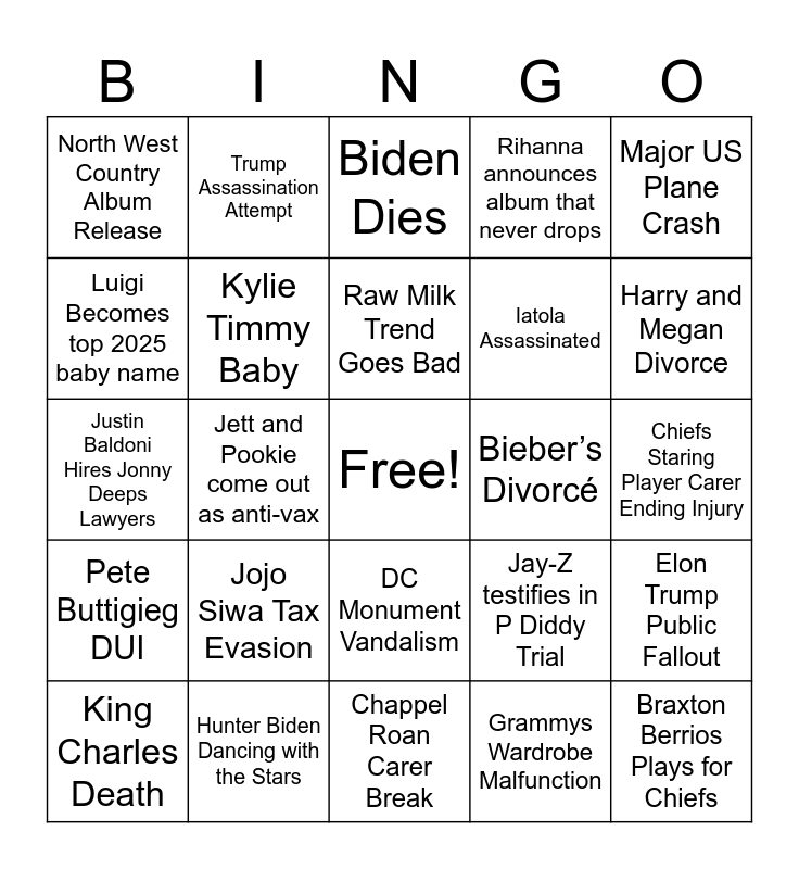 This bingo card has a free space and 24 words: Jojo Siwa Tax Evasion, Hunter Biden Dancing with the Stars, Raw Milk Trend Goes Bad, King Charles Death, Major US Plane Crash, North West Country Album Release, Luigi Becomes top 2025 baby name, Trump Assassination Attempt, Bieber’s Divorcé, DC Monument Vandalism, Iatola Assassinated, Justin Baldoni Hires Jonny Deeps Lawyers, Jay-Z testifies in P Diddy Trial, Elon Trump Public Fallout, Kylie Timmy Baby, Grammys Wardrobe Malfunction, Chiefs Staring Player Carer Ending Injury, Biden Dies, Harry and Megan Divorce, Jett and Pookie come out as anti-vax, Braxton Berrios Plays for Chiefs, Pete Buttigieg DUI, Rihanna announces album that never drops and Chappel Roan Carer Break.