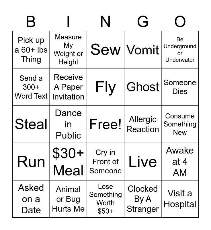 This bingo card has a free space and 25 words: $30+ Meal, Lose Something Worth $50+, Fly, Asked on a Date, Be Underground or Underwater, Pick up a 60+ lbs Thing, Send a 300+ Word Text, Measure My Weight or Height, Allergic Reaction, Cry in Front of Someone, Ghost, Steal, Live, Awake at 4 AM, Receive A Paper Invitation, Bake, Consume Something New, Sew, Someone Dies, Dance in Public, Visit a Hospital, Animal or Bug Hurts Me, Run, Vomit and Clocked By A Stranger.