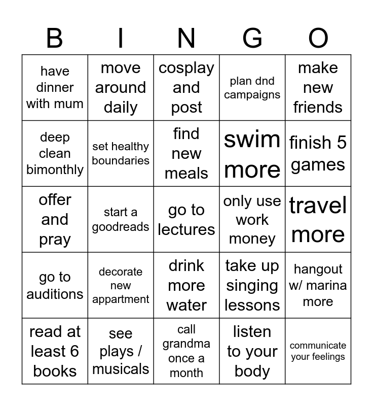 This bingo card has 25 words: decorate new appartment, call grandma once a month, find new meals, read at least 6 books, make new friends, have dinner with mum, deep clean bimonthly, move around daily, only use work money, drink more water, swim more, offer and pray, take up singing lessons, hangout w/ marina more, set healthy boundaries, communicate your feelings, travel more, cosplay and post, finish 5 games, start a goodreads, go to lectures, see plays / musicals, go to auditions, plan dnd campaigns and listen to your body.