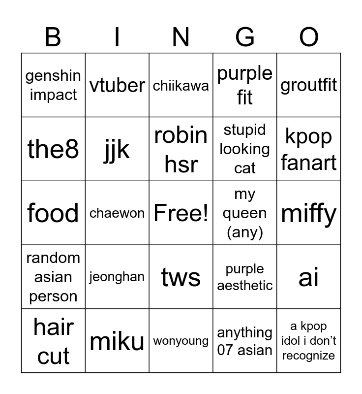This bingo card has a free space and 24 words: jeonghan, miku, robin hsr, hair cut, groutfit, genshin impact, the8, vtuber, my queen (any), tws, stupid looking cat, food, purple aesthetic, ai, jjk, anything 07 asian, miffy, chiikawa, kpop fanart, chaewon, a kpop idol i don’t recognize, random asian person, purple fit and wonyoung.
