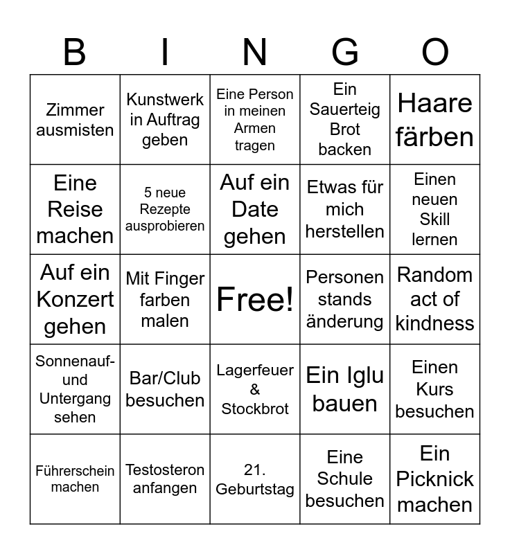 This bingo card has a free space and 24 words: Bar/Club besuchen, Testosteron anfangen, Auf ein Date gehen, Führerschein machen, Haare färben, Zimmer ausmisten, Eine Reise machen, Kunstwerk in Auftrag geben, Personen stands änderung, Lagerfeuer & Stockbrot, Etwas für mich herstellen, Auf ein Konzert gehen, Ein Iglu bauen, Einen Kurs besuchen, 5 neue Rezepte ausprobieren, Eine Schule besuchen, Random act of kindness, Eine Person in meinen Armen tragen, Einen neuen Skill lernen, Mit Finger farben malen, Ein Picknick machen, Sonnenauf- und Untergang sehen, Ein Sauerteig Brot backen and 21. Geburtstag.
