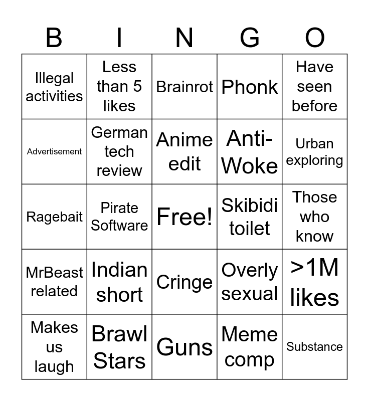 This bingo card has a free space and 24 words: Indian short, Brawl Stars, Anime edit, Makes us laugh, Have seen before, Illegal activities, Advertisement, Less than 5 likes, Skibidi toilet, Cringe, Anti-Woke, Ragebait, Overly sexual, >1M likes, German tech review, Meme comp, Those who know, Brainrot, Urban exploring, Pirate Software, Substance, MrBeast related, Phonk and Guns.