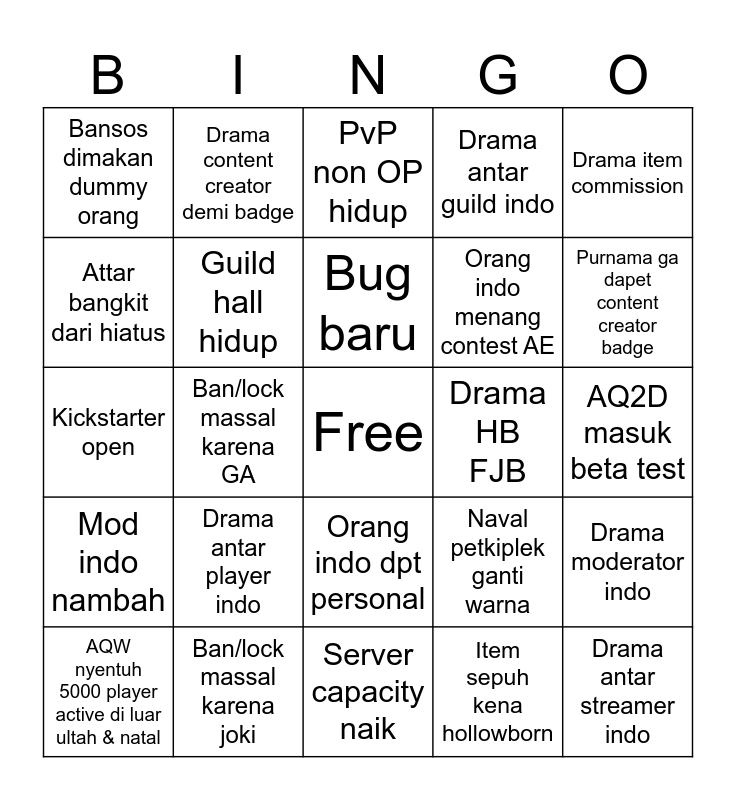 This bingo card has a free space and 24 words: Drama antar player indo, Ban/lock massal karena joki, Bug baru, AQW nyentuh 5000 player active di luar ultah & natal, Drama item commission, Bansos dimakan dummy orang, Attar bangkit dari hiatus, Drama content creator demi badge, Drama HB FJB, Orang indo dpt personal, Orang indo menang contest AE, Kickstarter open, Naval petkiplek ganti warna, Drama moderator indo, Guild hall hidup, Item sepuh kena hollowborn, AQ2D masuk beta test, PvP non OP hidup, Purnama ga dapet content creator badge, Ban/lock massal karena GA, Drama antar streamer indo, Mod indo nambah, Drama antar guild indo and Server capacity naik.