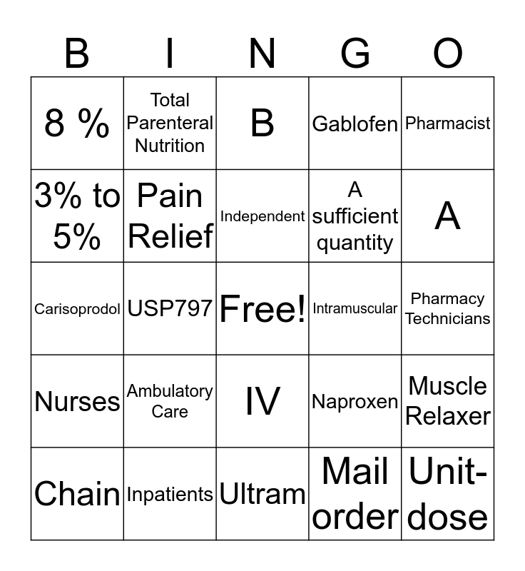 This bingo card has a free space and 24 words: Ambulatory Care, Inpatients, Independent, Chain, Pharmacist, 8 %, 3% to 5%, Total Parenteral Nutrition, Intramuscular, IV, A sufficient quantity, Carisoprodol, Naproxen, Muscle Relaxer, Pain Relief, Mail order, Pharmacy Technicians, B, A, USP797, Unit-dose, Nurses, Gablofen and Ultram.