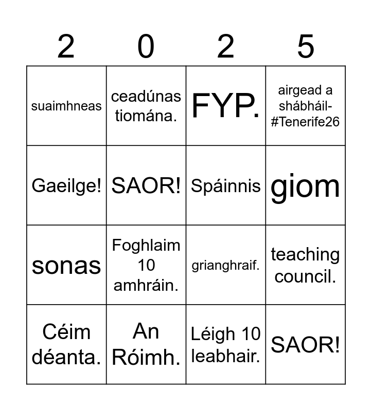 This bingo card has 16 words: Céim déanta., An Róimh., FYP., airgead a shábháil-#Tenerife26, Gaeilge!, ceadúnas tiomána., grianghraif., teaching council., suaimhneas, SAOR!, Léigh 10 leabhair., giom, sonas, Foghlaim 10 amhráin., Spáinnis and SAOR!.
