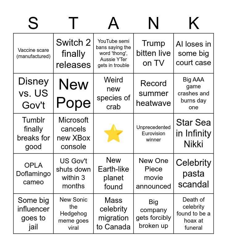 This bingo card has a free space and 24 words: US Gov't shuts down within 3 months, New Sonic the Hedgehog meme goes viral, Weird new species of crab, Some big influencer goes to jail, AI loses in some big court case, Vaccine scare (manufactured), Disney vs. US Gov't, Switch 2 finally releases, Unprecedented Eurovision winner, New Earth-like planet found, Record summer heatwave, Tumblr finally breaks for good, New One Piece movie announced, Celebrity pasta scandal, New Pope, Big company gets forcibly broken up, Star Sea in Infinity Nikki, YouTube semi bans saying the word 'thong', Aussie YTer gets in trouble, Big AAA game crashes and burns day one, Microsoft cancels new XBox console, Death of celebrity found to be a hoax at funeral, OPLA Doflamingo cameo, Trump bitten live on TV and Mass celebrity migration to Canada.