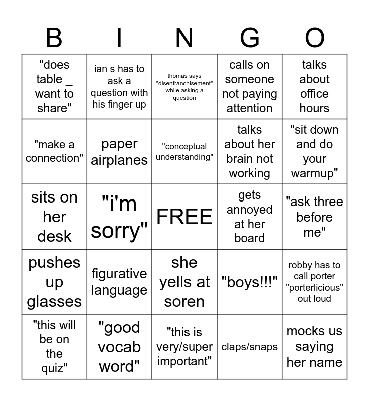 This bingo card has a free space and 32 words: claps/snaps, "growth mindset ", "i'm sorry", someone asks a question that she js answered, pushes up glasses, paper airplanes, talks about office hours, robby has to call porter "porterlicious" out loud, ian s has to ask a question with his finger up, she repeats something 3x in the same sentence, "conceptual understanding", thomas says "disenfranchisement" while asking a question, "come see me at lunch", "do you want to help us out __ ", gets annoyed at her board, "can we build on that", "this will be on the quiz", sits on her desk, she yells at soren, figurative language, "boys!!!", ari has to say conceptual understanding in a sentence, "ask three before me", "good vocab word", mocks us saying her name, calls on someone not paying attention, talks about her brain not working, "make a connection", "does table _ want to share", "this is very/super important", "table _ was having a great conversation" and "sit down and do your warmup".