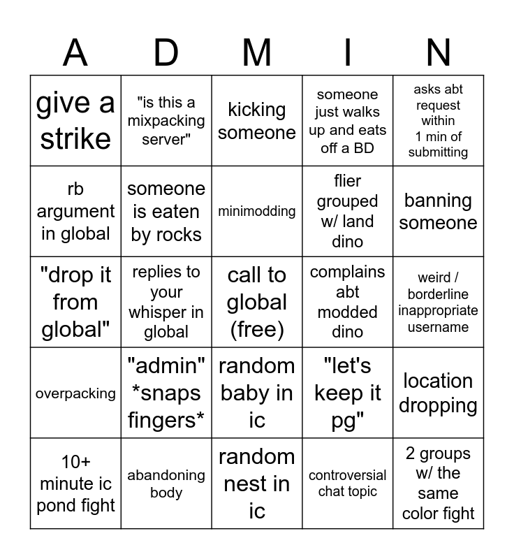 This bingo card has a free space and 24 words: "admin" *snaps fingers*, abandoning body, minimodding, 10+ minute ic pond fight, asks abt request within 1 min of submitting, give a strike, rb argument in global, "is this a mixpacking server", complains abt modded dino, random baby in ic, flier grouped w/ land dino, "drop it from global", "let's keep it pg", location dropping, someone is eaten by rocks, controversial chat topic, weird / borderline inappropriate username, kicking someone, banning someone, replies to your whisper in global, 2 groups w/ the same color fight, overpacking, someone just walks up and eats off a BD and random nest in ic.