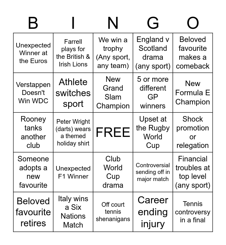 This bingo card has a free space and 24 words: Unexpected F1 Winner, Italy wins a Six Nations Match, New Grand Slam Champion, Beloved favourite retires, Beloved favourite makes a comeback, Unexpected Winner at the Euros, Verstappen Doesn't Win WDC, Farrell plays for the British & Irish Lions, Upset at the Rugby World Cup, Club World Cup drama, 5 or more different GP winners, Rooney tanks another club, Controversial sending off in major match, Financial troubles at top level (any sport), Athlete switches sport, Career ending injury, Shock promotion or relegation, We win a trophy (Any sport, any team), New Formula E Champion, Peter Wright (darts) wears a themed holiday shirt, Tennis controversy in a final, Someone adopts a new favourite, England v Scotland drama (any sport) and Off court tennis shenanigans.