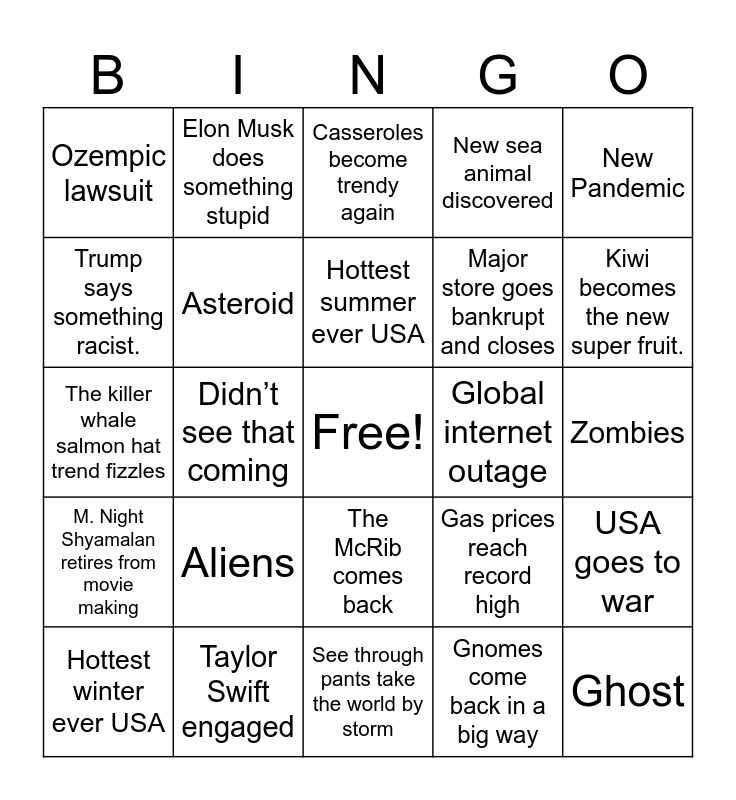 This bingo card has a free space and 24 words: Aliens, Taylor Swift engaged, Hottest summer ever USA, Hottest winter ever USA, New Pandemic, Ozempic lawsuit, Trump says something racist., Elon Musk does something stupid, Global internet outage, The McRib comes back, Major store goes bankrupt and closes, The killer whale salmon hat trend fizzles, Gas prices reach record high, USA goes to war, Asteroid, Gnomes come back in a big way, Zombies, Casseroles become trendy again, Kiwi becomes the new super fruit., Didn’t see that coming, Ghost, M. Night Shyamalan retires from movie making, New sea animal discovered and See through pants take the world by storm.