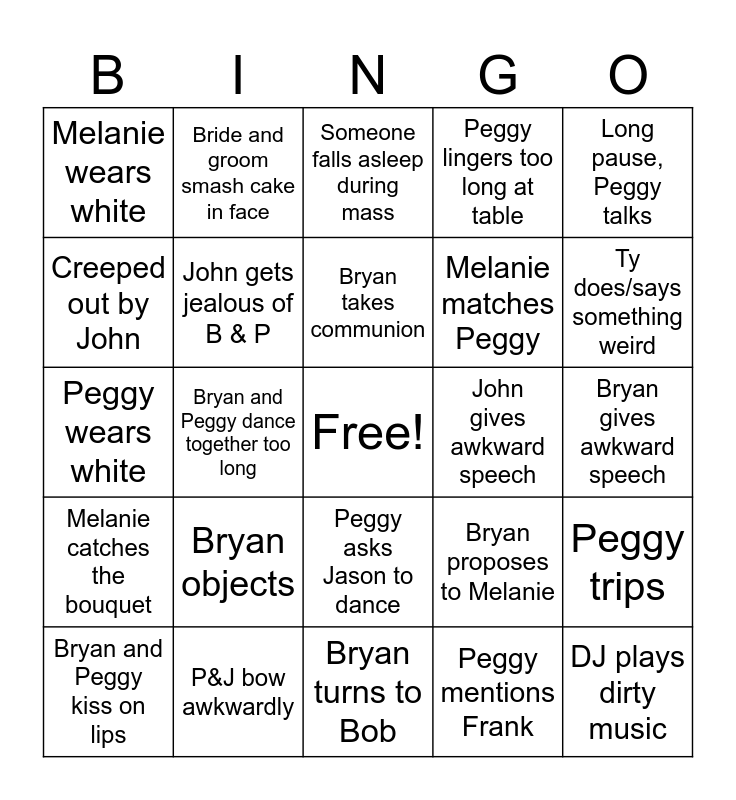 This bingo card has a free space and 24 words: Bryan objects, P&J bow awkwardly, Bryan takes communion, Bryan and Peggy kiss on lips, Long pause, Peggy talks, Melanie wears white, Creeped out by John, Bride and groom smash cake in face, John gives awkward speech, Peggy asks Jason to dance, Melanie matches Peggy, Peggy wears white, Bryan proposes to Melanie, Peggy trips, John gets jealous of B & P, Peggy mentions Frank, Bryan gives awkward speech, Someone falls asleep during mass, Ty does/says something weird, Bryan and Peggy dance together too long, DJ plays dirty music, Melanie catches the bouquet, Peggy lingers too long at table and Bryan turns to Bob.