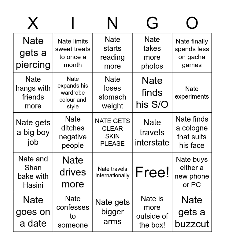 This bingo card has 25 words: Nate drives more, Nate gets bigger arms, Nate loses stomach weight, Nate goes on a date, Nate finally spends less on gacha games, Nate gets a piercing, Nate hangs with friends more, Nate limits sweet treats to once a month, Nate travels interstate, Nate travels internationally, Nate finds his S/O, Nate gets a big boy job, Free!, Nate buys either a new phone or PC, Nate expands his wardrobe colour and style, Nate gets a buzzcut, Nate finds a cologne that suits his face, Nate starts reading more, Nate experiments, Nate ditches negative people, NATE GETS CLEAR SKIN PLEASE, Nate confesses to someone, Nate and Shan bake with Hasini, Nate takes more photos and Nate is more outside of the box!.