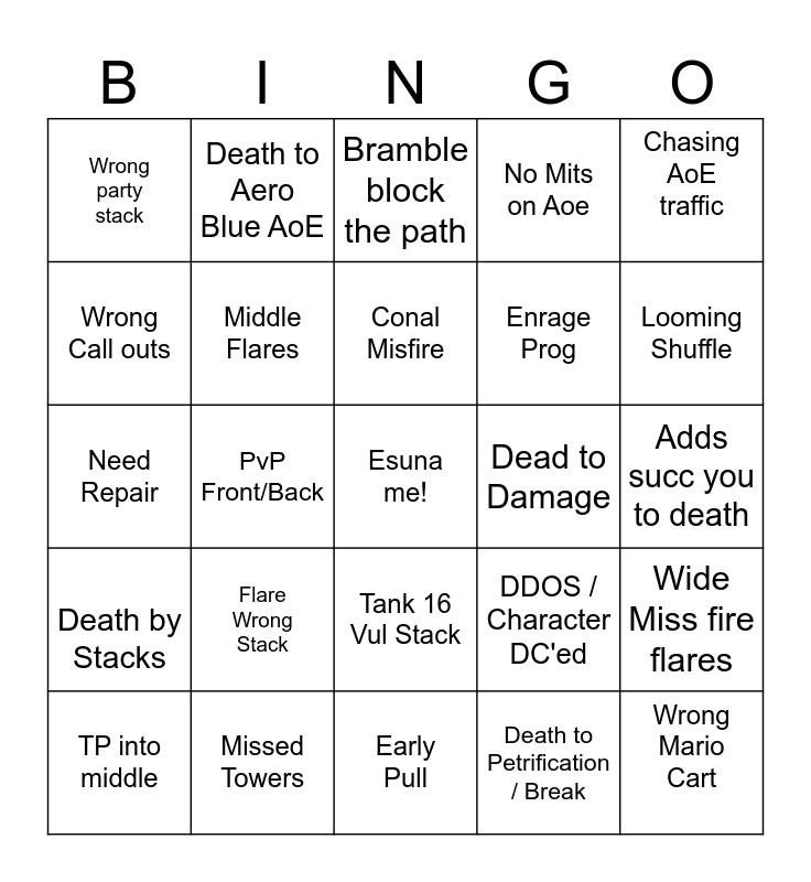 This bingo card has a free space and 24 words: Flare Wrong Stack, Missed Towers, Conal Misfire, TP into middle, Chasing AoE traffic, Wrong party stack, Wrong Call outs, Death to Aero Blue AoE, Dead to Damage, Tank 16 Vul Stack, Enrage Prog, Need Repair, DDOS / Character DC'ed, Wide Miss fire flares, Middle Flares, Death to Petrification / Break, Adds succ you to death, Bramble block the path, Looming Shuffle, PvP Front/Back, Wrong Mario Cart, Death by Stacks, No Mits on Aoe and Early Pull.