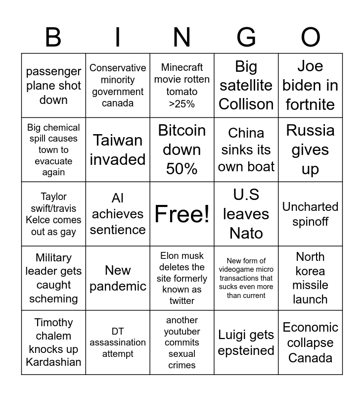 This bingo card has a free space and 24 words: New pandemic, DT assassination attempt, Bitcoin down 50%, Timothy chalem knocks up Kardashian, Joe biden in fortnite, passenger plane shot down, Big chemical spill causes town to evacuate again, Conservative minority government canada, U.S leaves Nato, Elon musk deletes the site formerly known as twitter, China sinks its own boat, Taylor swift/travis Kelce comes out as gay, New form of videogame micro transactions that sucks even more than current, North korea missile launch, Taiwan invaded, Luigi gets epsteined, Uncharted spinoff, Minecraft movie rotten tomato >25%, Russia gives up, AI achieves sentience, Economic collapse Canada, Military leader gets caught scheming, Big satellite Collison and another youtuber commits sexual crimes.