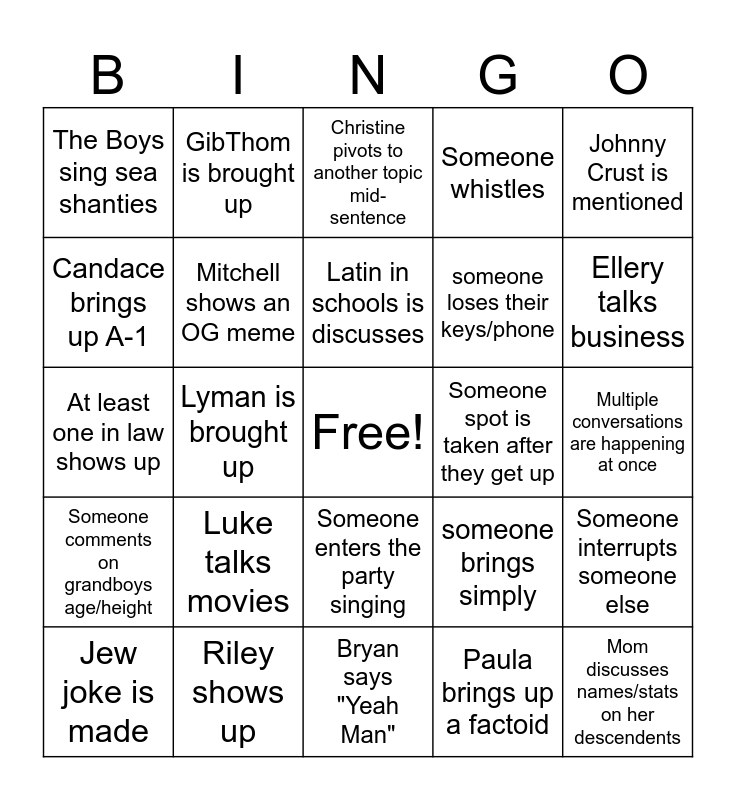 This bingo card has a free space and 29 words: Jew joke is made, Someone makes an Owen List, Lyman is brought up, Someone talks about family stores, The Boys sing sea shanties, Christine pivots to another topic mid-sentence, Mitchell shows an OG meme, Luke talks movies, Someone spot is taken after they get up, Riley shows up, Multiple conversations are happening at once, Mom discusses names/stats on her descendents, Bryan says "Yeah Man", Paula brings up a factoid, Ellery talks business, Favorite daughter conversation ensues, Someone enters the party singing, Someone comments on grandboys age/height, Johnny Crust is mentioned, At least one in law shows up, someone brings simply, sisters try to bamboozle someone, someone loses their keys/phone, Candace brings up A-1, Someone whistles, GibThom is brought up, Someone interrupts someone else, Latin in schools is discusses and Shauna says "wee-hoo".