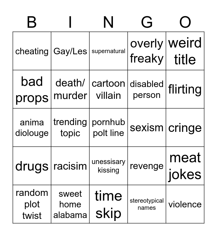 This bingo card has a free space and 24 words: racisim, sweet home alabama, cartoon villain, random plot twist, weird title, cheating, bad props, Gay/Les, sexism, unessisary kissing, disabled person, anima diolouge, revenge, meat jokes, death/ murder, stereotypical names, cringe, supernatural, flirting, trending topic, violence, drugs, overly freaky and time skip.