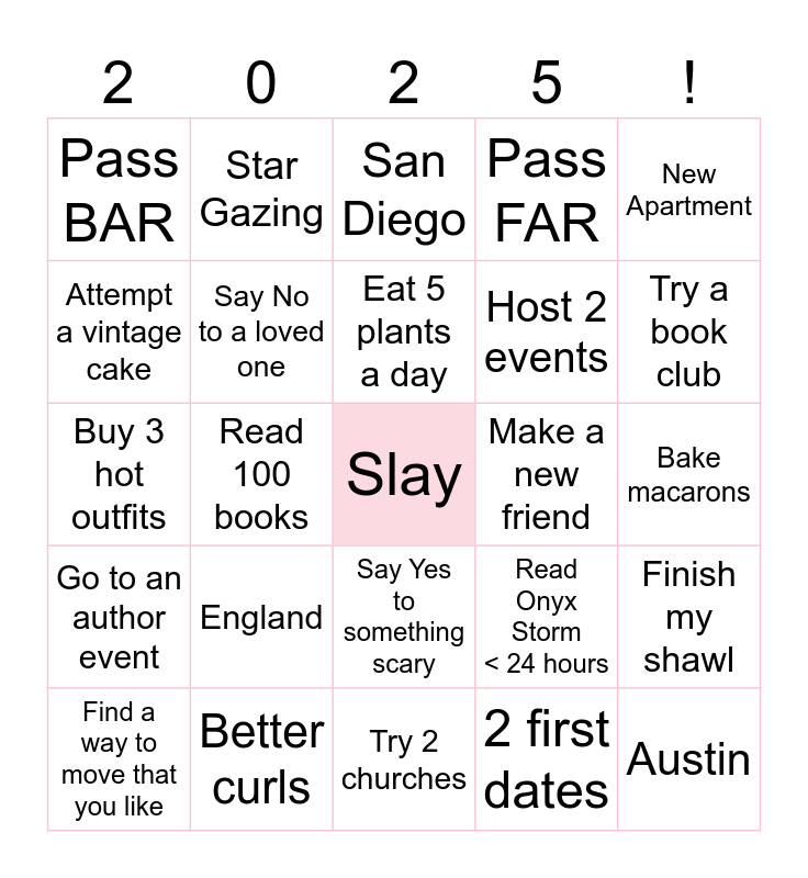This bingo card has a free space and 24 words: England, Better curls, Eat 5 plants a day, Find a way to move that you like, New Apartment, Pass BAR, Attempt a vintage cake, Star Gazing, Make a new friend, Say Yes to something scary, Host 2 events, Buy 3 hot outfits, Read Onyx Storm < 24 hours, Finish my shawl, Say No to a loved one, 2 first dates, Bake macarons, San Diego, Try a book club, Read 100 books, Austin, Go to an author event, Pass FAR and Try 2 churches.