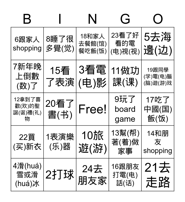 This bingo card has a free space and 24 words: 1表演樂(乐)器, 2打球, 3看電(电)影, 4滑(huá)雪或滑(huá)冰, 5去海邊(边), 6跟家人shopping, 7新年晚上倒數(数)了, 8睡了很多覺(觉), 9玩了board game, 10旅遊(游), 11做功課(课), 12拿到了喜歡(欢)的聖誕(诞)禮(礼)物, 13幫(帮)著(着)做家事, 14和朋友shopping, 15看了表演, 16跟朋友打電(电)話(话), 17吃了中國(国)飯(饭), 18和家人去餐館(馆)餐吃飯(饭), 19跟同學(学)電(电)腦(脑)遊(游)戏, 20看了書(书), 21去走路, 22買(买)新衣, 23看了好看的電(电)視(视) and 24去朋友家.