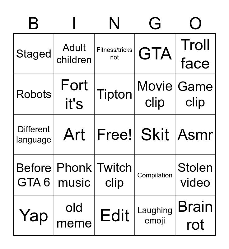 This bingo card has a free space and 50 words: Mr beast, Brain rot, Cringe, Edit, Phonk music, Green screen, Adult children, What, Robots, Minecraft, Fort it's, GTA, Stolen video, Compilation, Animals, Story time, Tipton, Skit, Skull emoji, Troll face, Art, Laughing emoji, Staged, Movie clip, Family guy, Among us, Game clip, Prouct/ad, Fitness/tricks not, Twitch clip, less than 10k like, Red bull, Pov, Meme, old meme, Aura, New year, sus, Subway surfers, Asmr, Watermark, Quote, Cringe adult, Cap that's, Yap, Different language, Popular song, ___ gang, Before GTA 6 and Food.