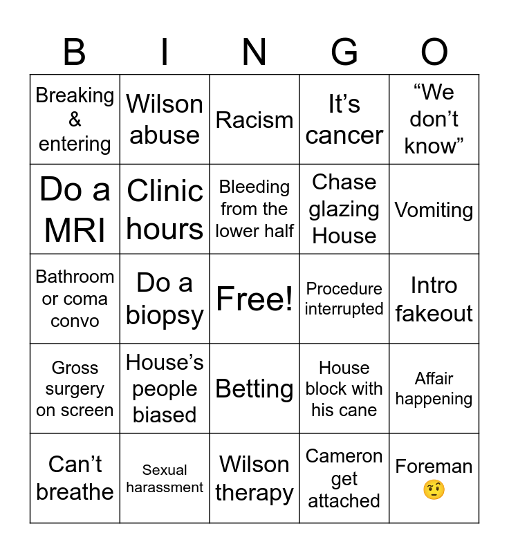 This bingo card has a free space and 30 words: Sexual harassment, Stroke, Do a biopsy, Do a LP, Breaking & entering, Racism, Clinic hours, Betting, Procedure interrupted, Wilson therapy, Intro fakeout, Foreman 🤨, Cameron get attached, Epiphany, Vomiting, Snitching to Cuddy, House block with his cane, Gross surgery on screen, House’s people biased, “We don’t know”, Bathroom or coma convo, Premature patient dispatch, Wilson abuse, Chase glazing House, Do a MRI, It’s cancer, Affair happening, Can’t breathe, Bleeding from the lower half and Seizure.