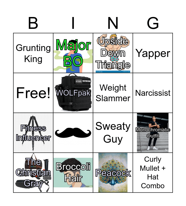 This bingo card has 9 images and 15 words: Broccoli Hair, Monochromatic Outfit, Upside Down Triangle, Grunting King, Fitness Influencer, Major BO, Sweaty Guy, Peacock, Free!, WOLFpak, The Christian Gray, Yapper, Narcissist, Weight Slammer and Curly Mullet + Hat Combo.