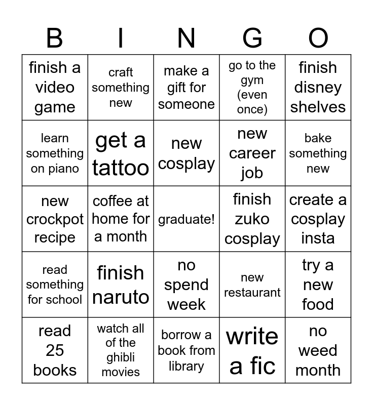 This bingo card has a free space and 24 words: finish naruto, watch all of the ghibli movies, new cosplay, read 25 books, finish disney shelves, finish a video game, learn something on piano, craft something new, finish zuko cosplay, no spend week, new career job, new crockpot recipe, new restaurant, try a new food, get a tattoo, write a fic, create a cosplay insta, make a gift for someone, bake something new, coffee at home for a month, no weed month, read something for school, go to the gym (even once) and borrow a book from library.