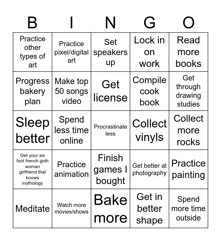 This bingo card has a free space and 24 words: Meditate, Practice animation, Get license, Get in better shape, Read more books, Practice other types of art, Practice pixel/digital art, Set speakers up, Collect vinyls, Collect more rocks, Sleep better, Make top 50 songs video, Get better at photography, Practice painting, Progress bakery plan, Watch more movies/shows, Bake more, Lock in on work, Get through drawing studies, Get your six foot french goth woman girlfriend that knows mythology, Spend less time online, Finish games I bought, Compile cook book and Spend more time outside.