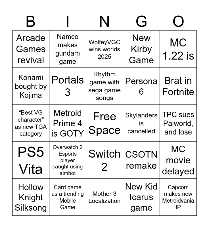 This bingo card has a free space and 24 words: Overwatch 2 Esports player caught using aimbot, Card game as a trending Mobile Game, Rhythm game with sega game songs, Hollow Knight Silksong, MC 1.22 is, Arcade Games revival, Konami bought by Kojima, Namco makes gundam game, Skylanders is cancelled, Switch 2, Persona 6, “Best VG character” as new TGA category, CSOTN remake, MC movie delayed, Portals 3, New Kid Icarus game, TPC sues Palworld, and lose, WolfeyVGC wins worlds 2025, Brat in Fortnite, Metroid Prime 4 is GOTY, Capcom makes new Metroidvania IP, PS5 Vita, New Kirby Game and Mother 3 Localization.