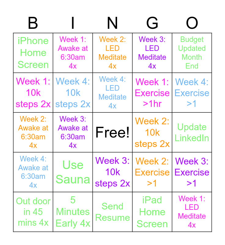 This bingo card has a free space and 24 words: Use Sauna, 5 Minutes Early 4x, Week 4: LED Meditate 4x, Out door in 45 mins 4x, Budget Updated Month End, iPhone Home Screen, Week 1: 10k steps 2x, Week 1: Awake at 6:30am 4x, Week 2: 10k steps 2x, Week 3: 10k steps 2x, Week 1: Exercise >1hr, Week 2: Awake at 6:30am 4x, Week 2: Exercise >1, Week 3: Exercise >1, Week 4: 10k steps 2x, iPad Home Screen, Update LinkedIn, Week 2: LED Meditate 4x, Week 4: Exercise >1, Week 3: Awake at 6:30am 4x, Week 1: LED Meditate 4x, Week 4: Awake at 6:30am 4x, Week 3: LED Meditate 4x and Send Resume.