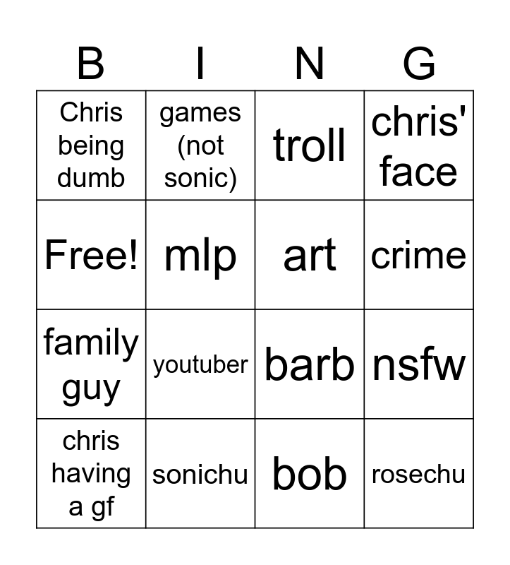 This bingo card has 16 words: sonichu, nsfw, troll, Chris being dumb, family guy, games (not sonic), barb, bob, Free!, mlp, chris having a gf, chris' face, youtuber, crime, art and rosechu.