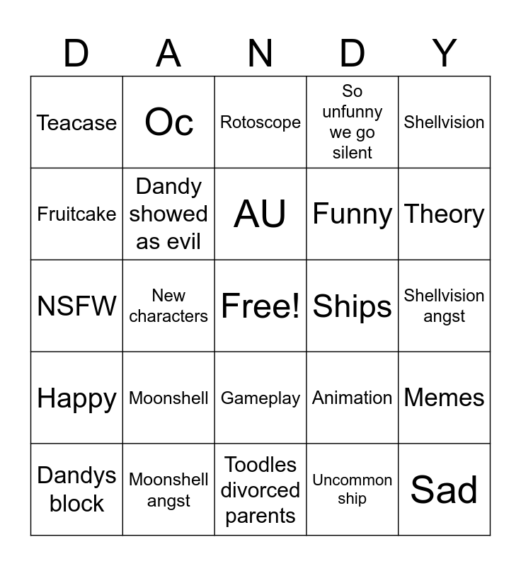This bingo card has a free space and 24 words: Moonshell, Moonshell angst, AU, Dandys block, Shellvision, Teacase, Fruitcake, Oc, Ships, Gameplay, Funny, NSFW, Animation, Memes, Dandy showed as evil, Uncommon ship, Shellvision angst, Rotoscope, Theory, New characters, Sad, Happy, So unfunny we go silent and Toodles divorced parents.